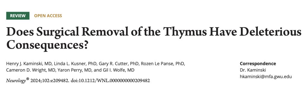 Kaminski HJ, Kusner LL, Cutter GR, Le Panse R, Wright CD, Perry Y, Wolfe GI.Does Surgical Removal of the Thymus Have Deleterious Consequences? Neurology. 2024 Jun 25;102(12):e209482.