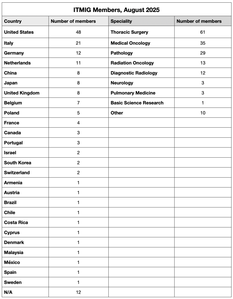 As of August 26, 2025, ITMIG had 167 active members from around the world, representing various specialties.